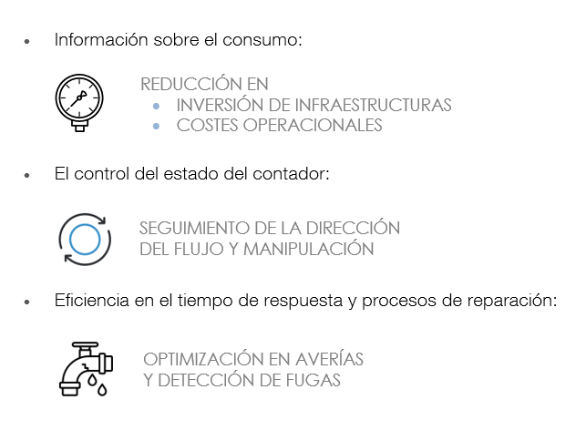 La solución Smart Water de IoTsens consiste en contadores de tele-lectura integral que captan datos de forma remota y los envían al software de gestión para su control en tiempo real. Este software es capaz de recabar información de 9 marcas diferentes de contadores (Sensus, Itron, Elster, Diehl, Conthidra, Contazara, Kamstrup, Zenner y Abering) de forma eficiente. Esta solución permite controlar y rastrear con precisión la gestión del agua de los hogares y así el cliente puede beneficiarse de múltiples utilidades: