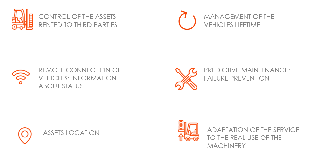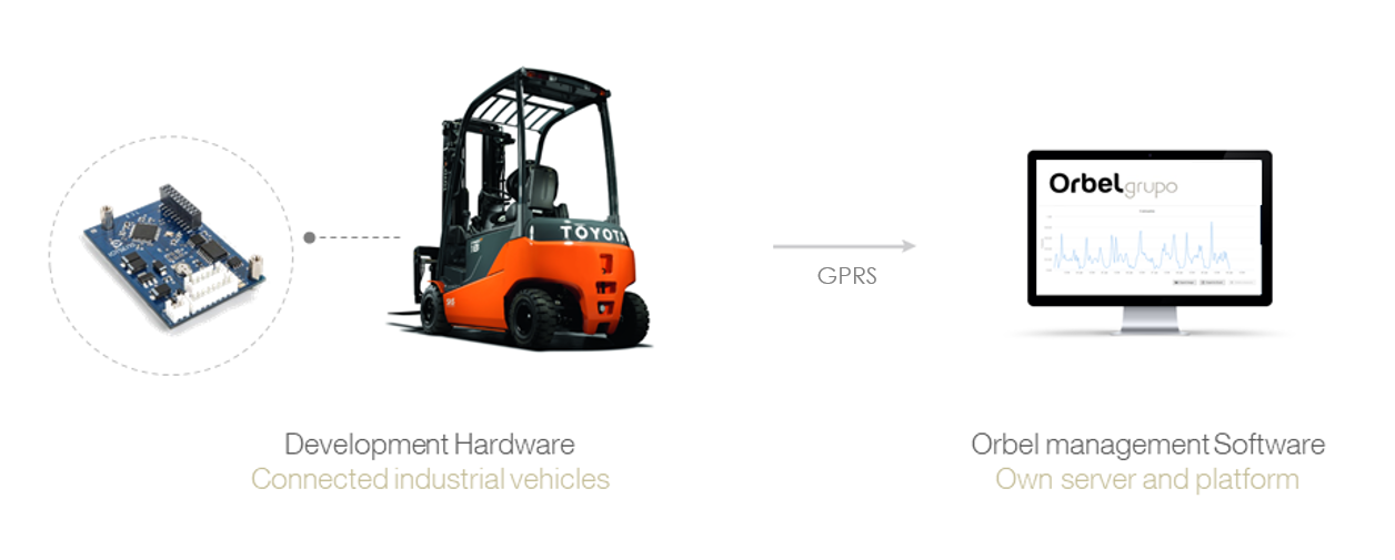 The solution has been developed based on the Orbel information needs. It consists of connecting the forklifts to the cloud through a device installed in each of them in order to identify the operation hours, as well as the control of the proper use. The device also allows the client to know the location of each machine.